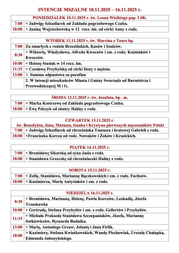 Intencje Mszalne 27.10. – 02.11.2025 r.