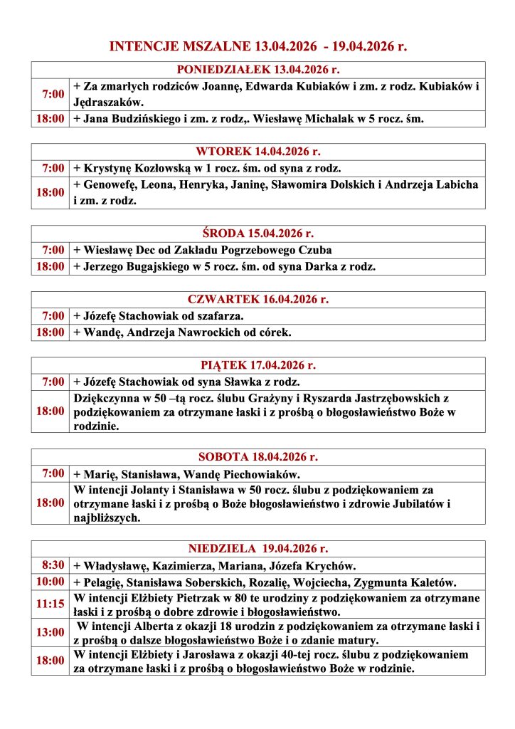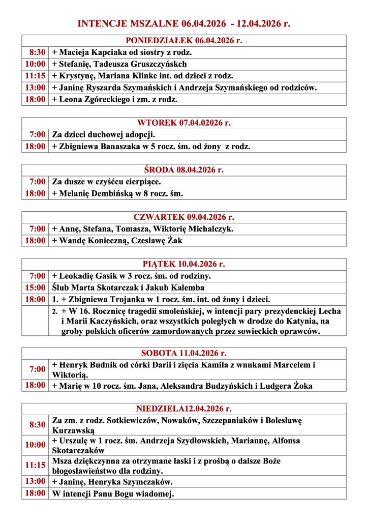 Intencje Mszalne 30.03. – 05.04.2026 r.